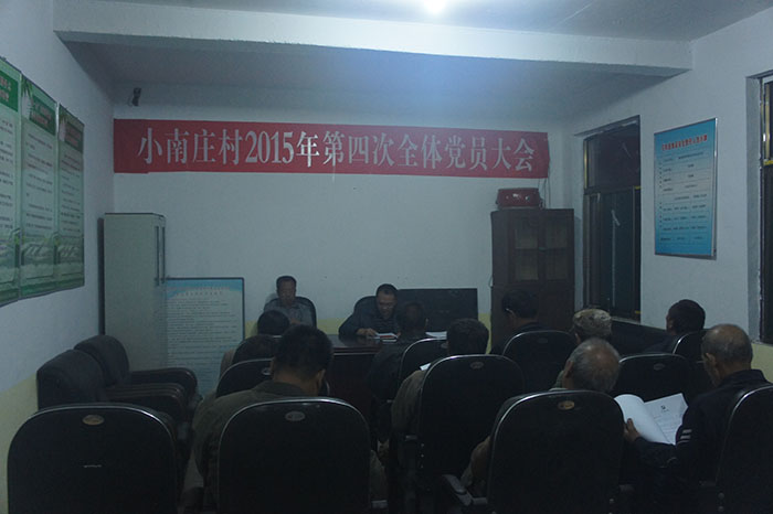 芹泉镇小南庄村召开2015年第四次全体党员大会 (村情动态信息2015年第1期) 2015年8月25日晚9:00,小南庄村支部委员会召开了2015年第四次全体党员大会,全村共有党员52名(土棚村10名),除去外出务工流动党员17人,在村党员共35人,应到35人、实到25人,符合人数要求,会议由邓春雁书记主持,芹泉镇农经站副站长王磊同志出席会议。第一项议程,王磊同志代表镇党委宣读了任晋同志任职小南..