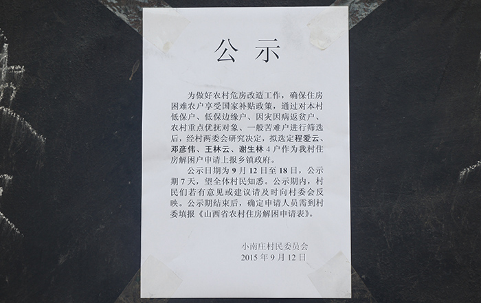 小南庄村农村住房解困户名单公示 公 示 为做好农村危房改造工作,确保住房困难农户享受国家补贴政策,通过对本村低保户、低保边缘户、因灾因病返贫户、农村重点优抚对象、一般苦难户进行筛选后,经村两委会研究决定,拟选定程爱云、邓彦伟、王林云、谢生林4户作为我村住房解困户申请上报乡镇政府。 公示日期为9月12日至18日,公示期7天,望全体村民知悉。公示期内,村民们若有意见或建议..